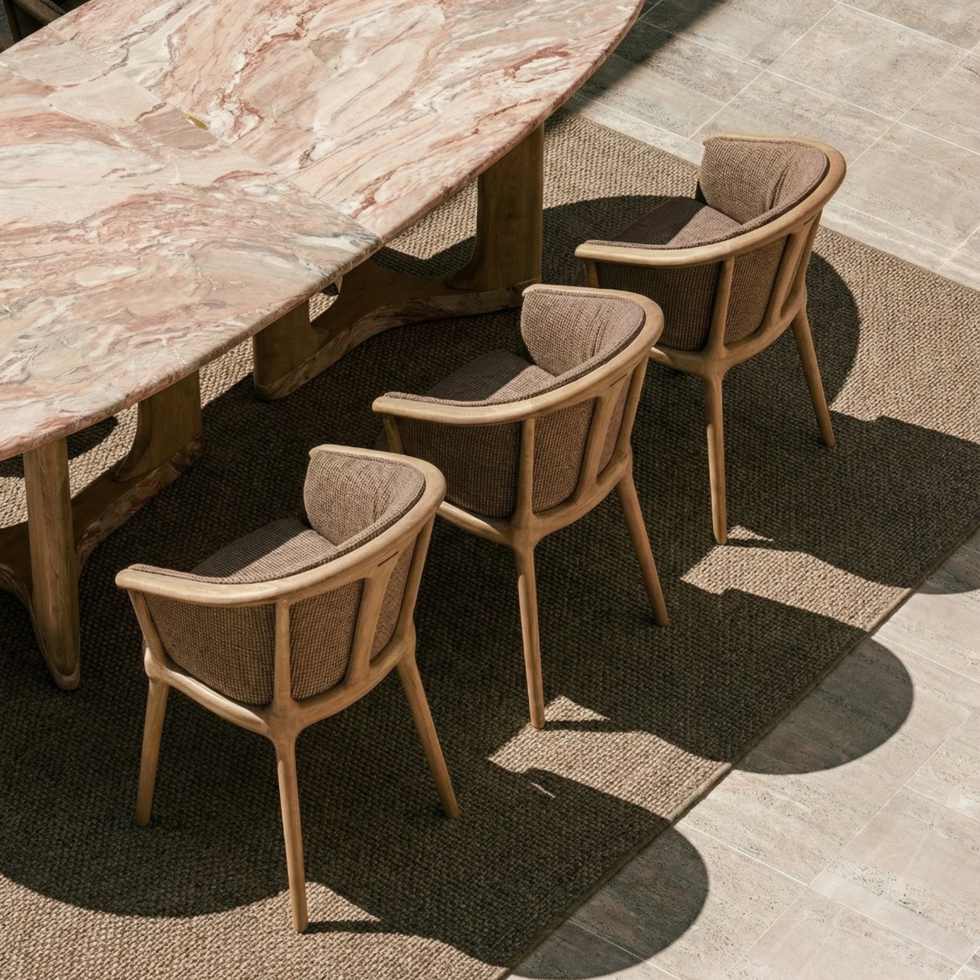 The Arbor dining table complements the chairs with a base crafted from iroko wood that evokes the shapes of tree branches, supporting a marble tabletop. This combination ensures stability and a natural aesthetic. Designed as a central gathering spot, the table provides a space for meals and moments that leave a lasting impression, elevating the outdoor dining experience.