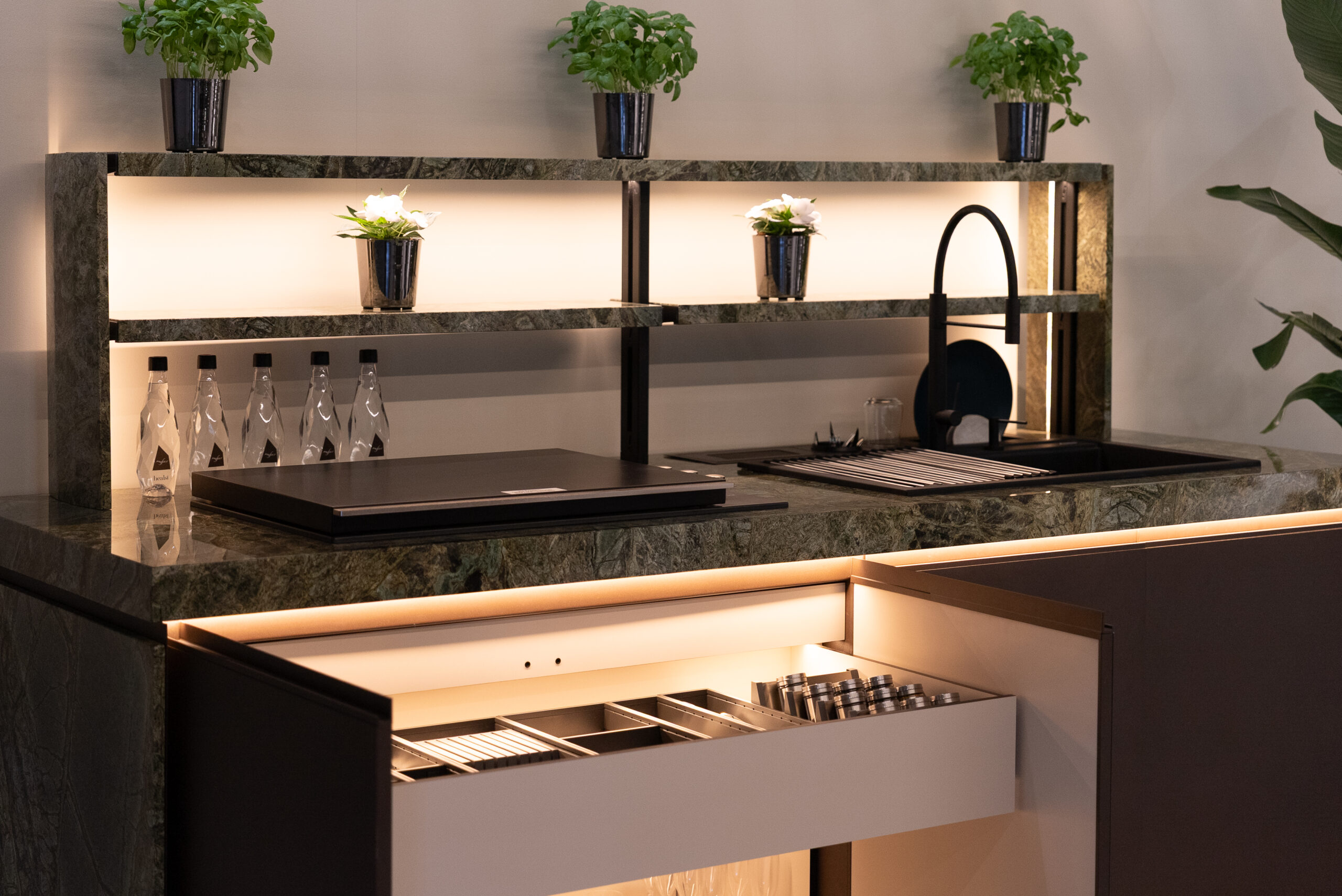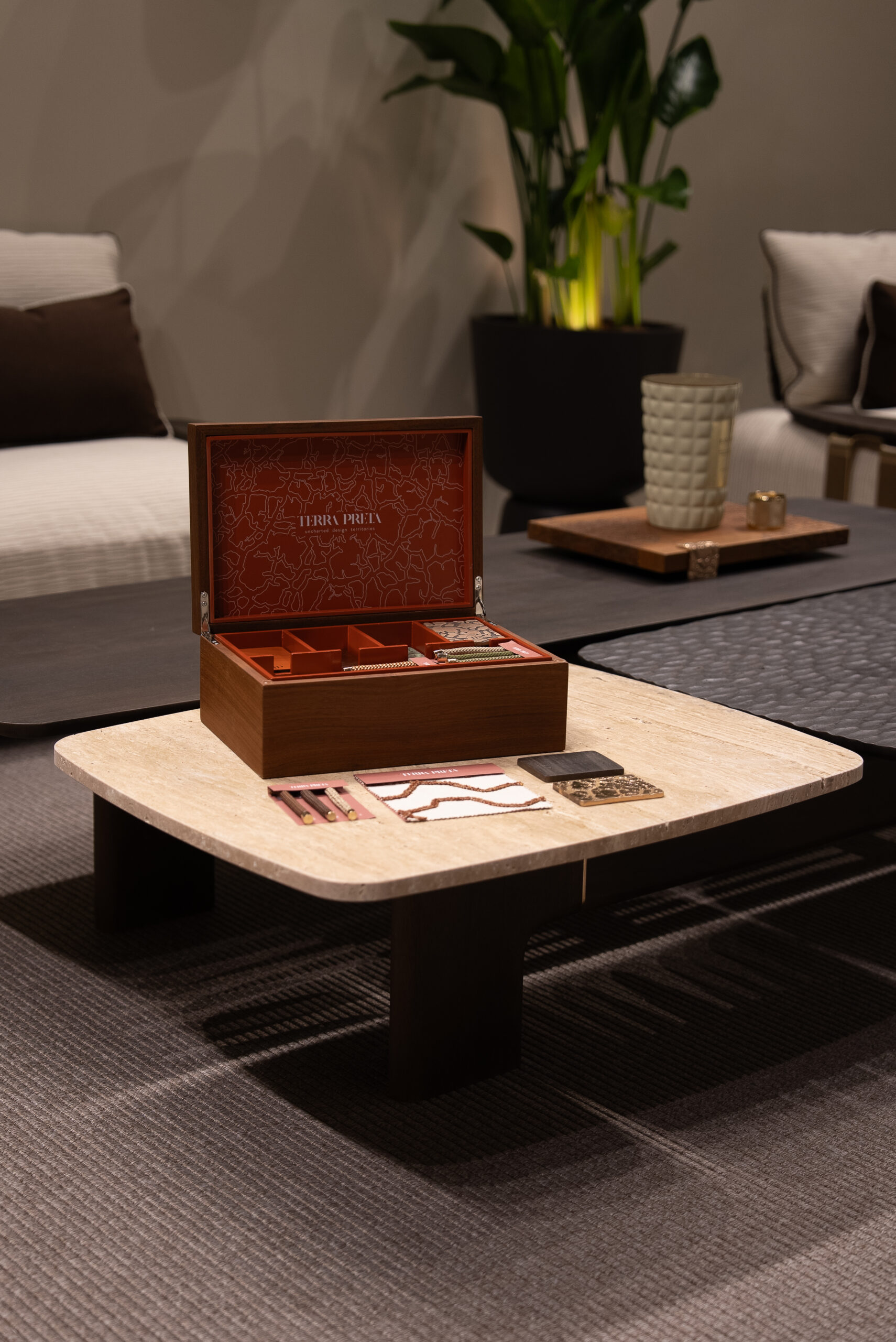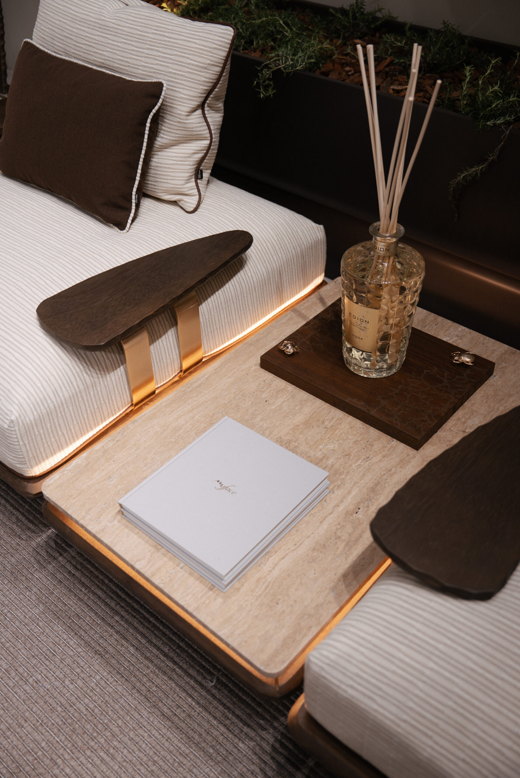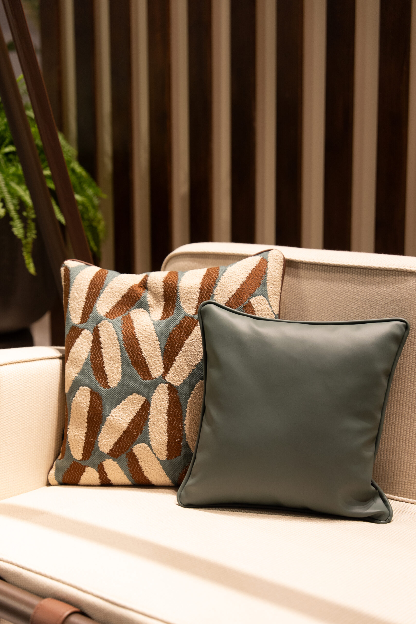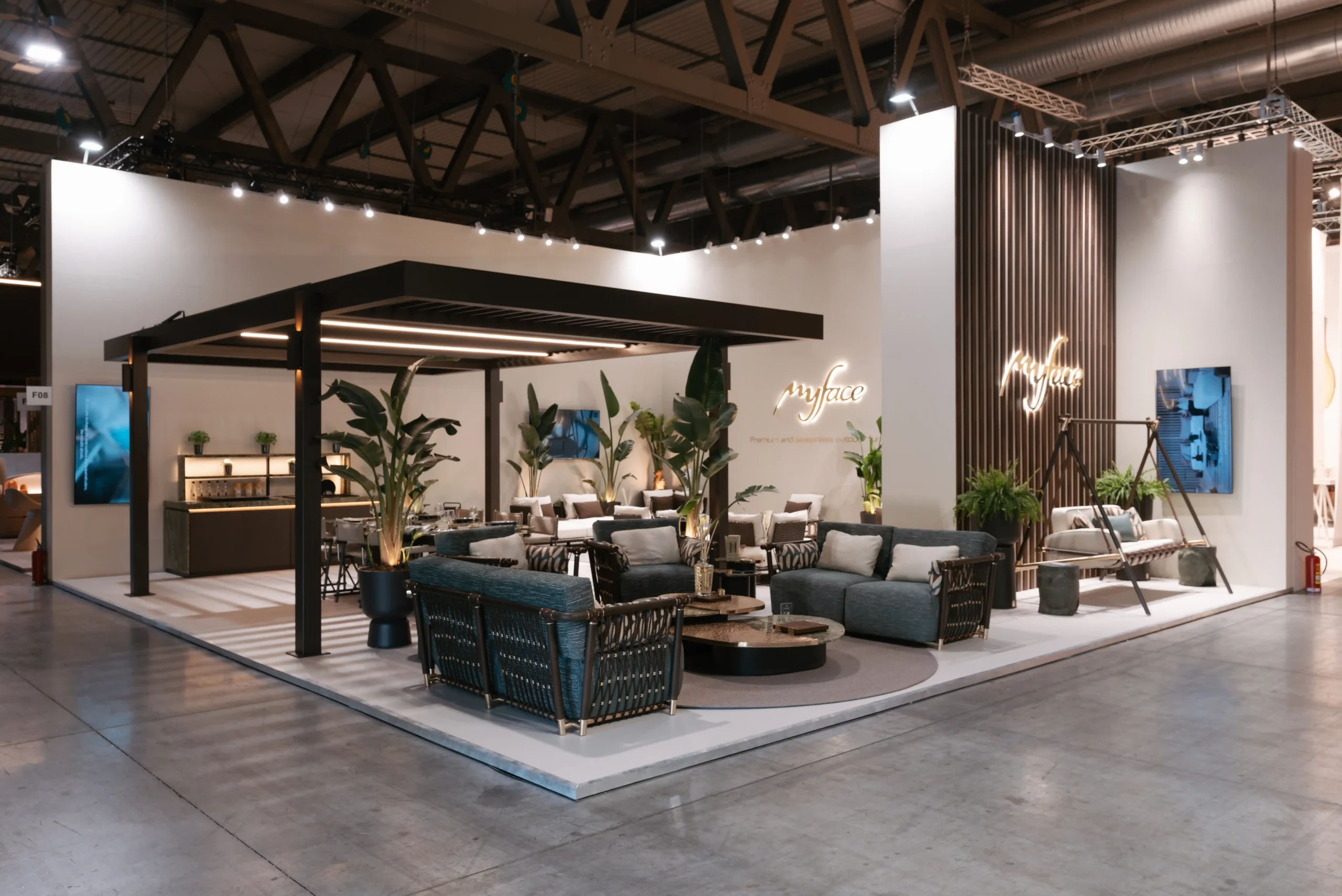 Across the stand, we worked with leading outdoor fabric houses, including Mariaflora, Black Edition, and Agora. Their materials played an essential role in shaping the atmosphere of the space, bringing depth, tactility, and a sense of continuity between furniture and environment.