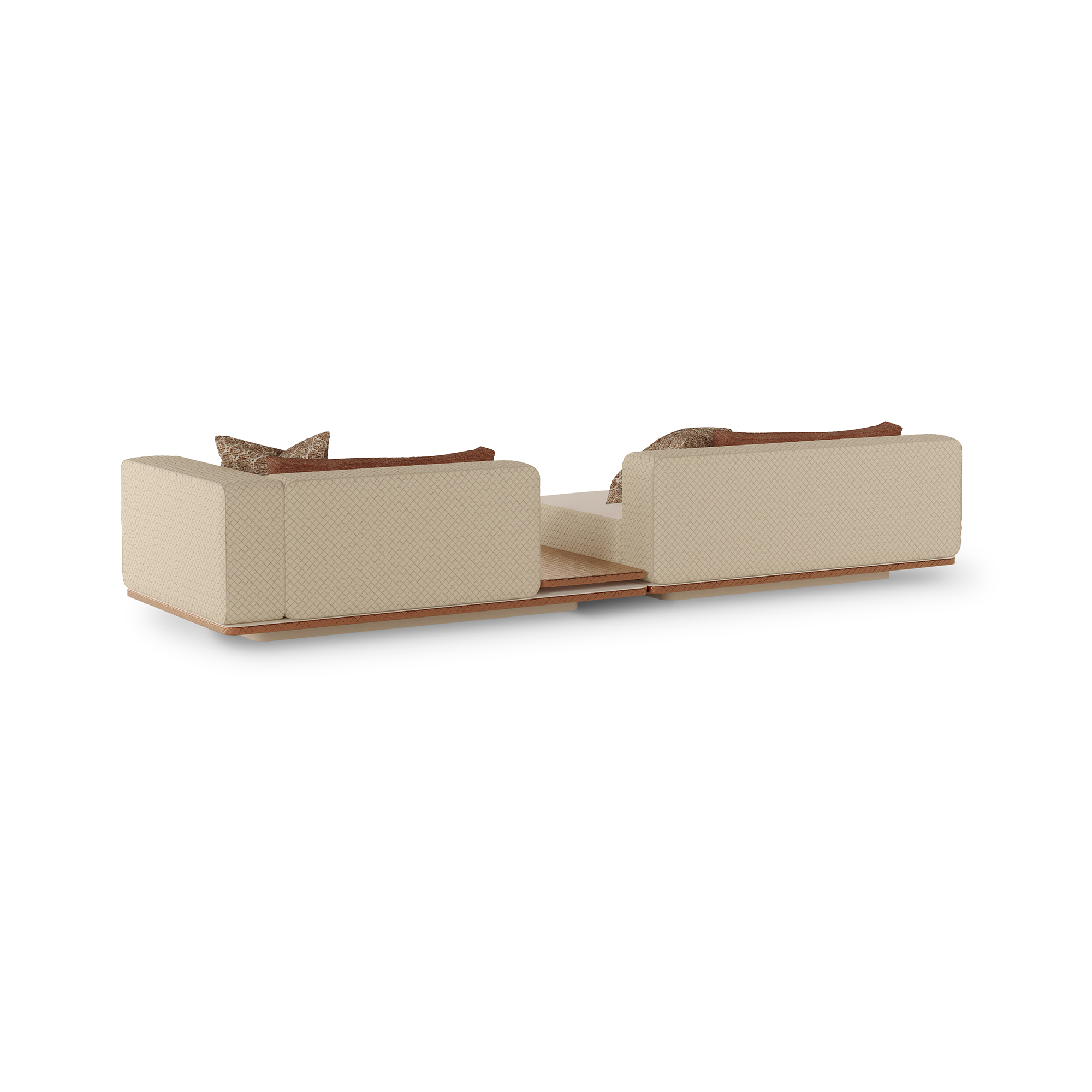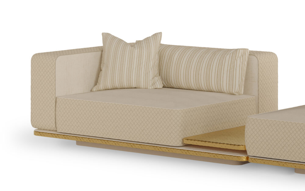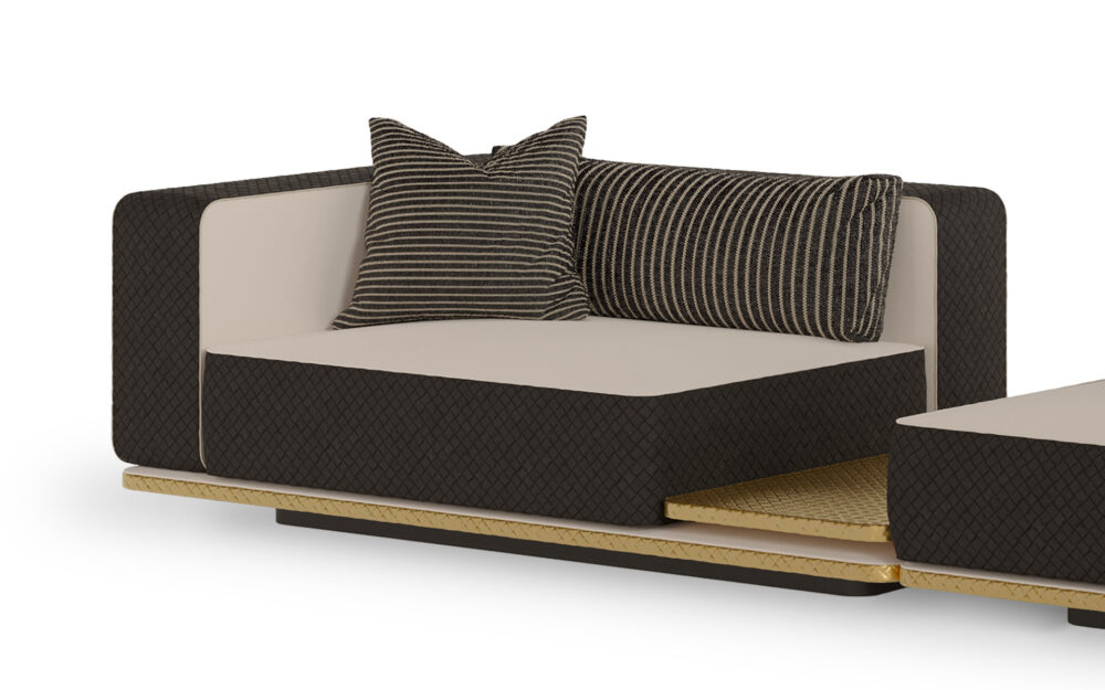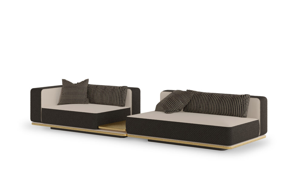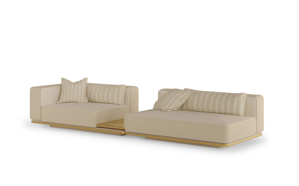 Inspired by the nobility of tribal communities and their profound connection to the earth, Ayra combines structural strength with comfort in a refined sofa designed for outdoor living. The textured metal base with a braided pattern ensures robustness and stability, while the firm-looking upholstery provides exceptional comfort. Crafted with highly resistant materials suited for outdoor conditions, it withstands weather exposure, sunlight, and humidity, ensuring durability without compromising sophistication. Its modular system allows for multiple configurations, including a module with an integrated side table that adds functionality to the sofa’s elegant design.