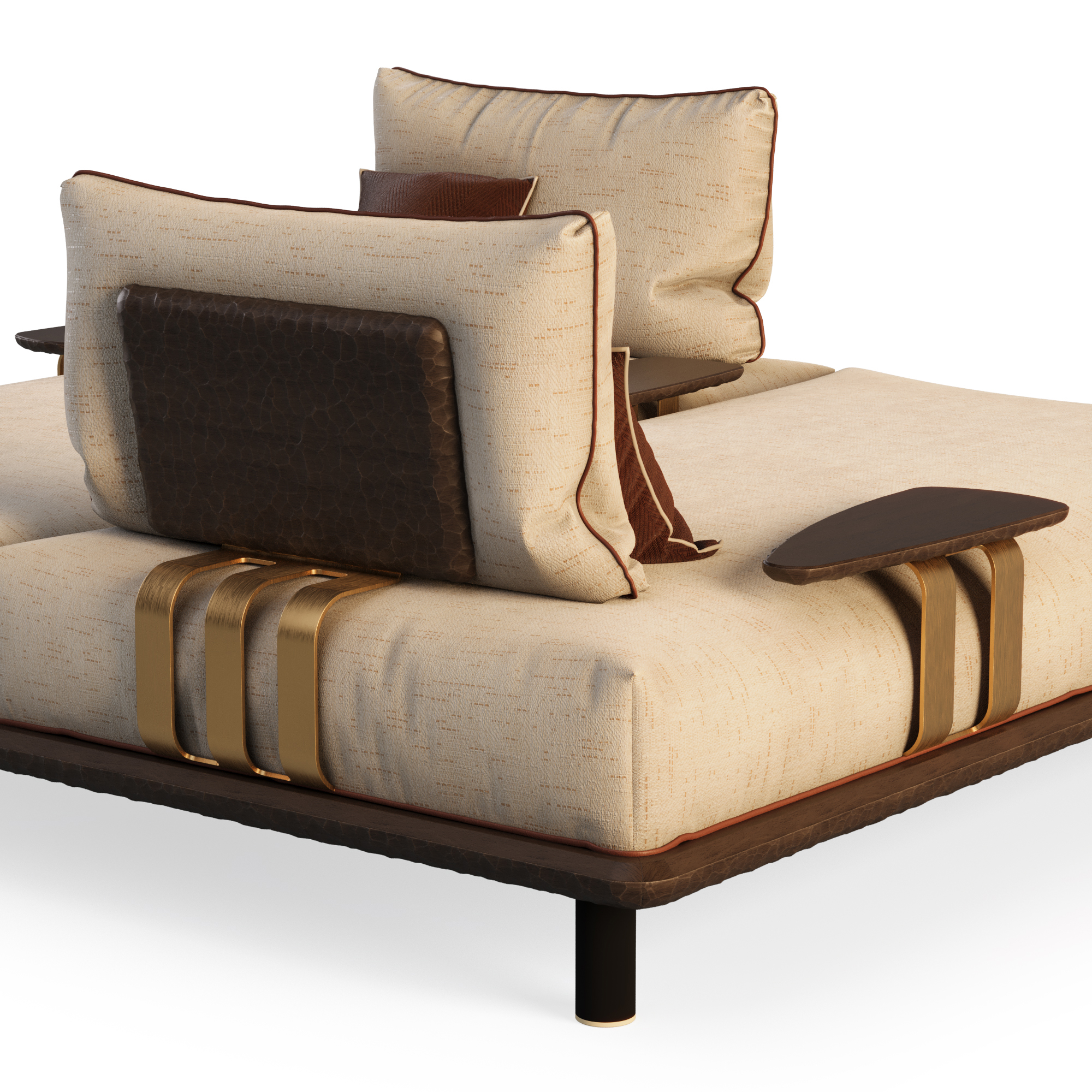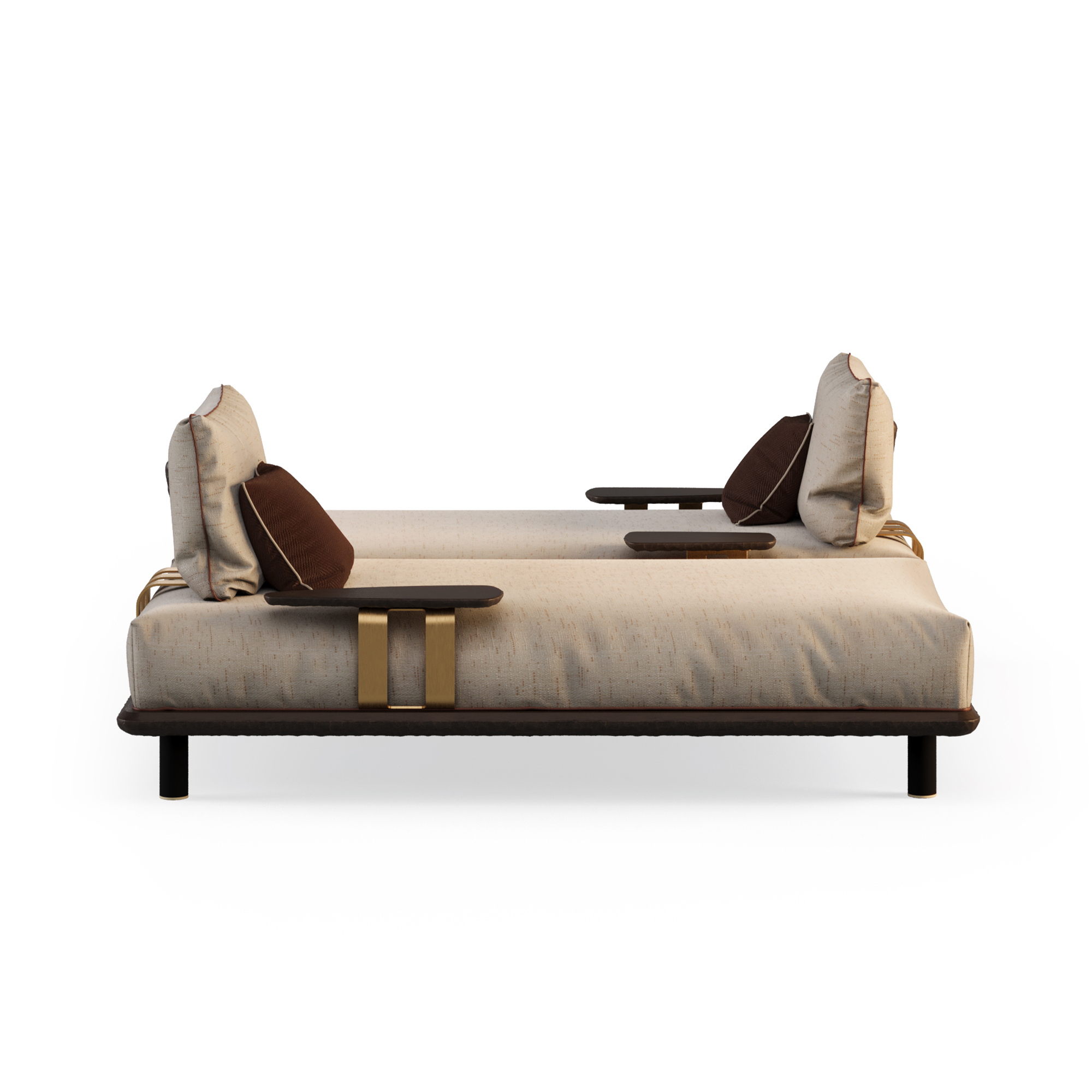 The Kaya double sunbed was born from the desire to create a shared pause , a place where two bodies rest side by side and time slows to the rhythm of nature. With a solid, textured wooden frame at the heart of its design, and a wide, serene silhouette, it evokes the simplicity of the purest moments of rest like a hand-shaped shelter between shade and light. Whether on its own or paired with a side table, Kaya invites a return to the essential: noble materials in their purest form, and comfort as a fundamental presence.