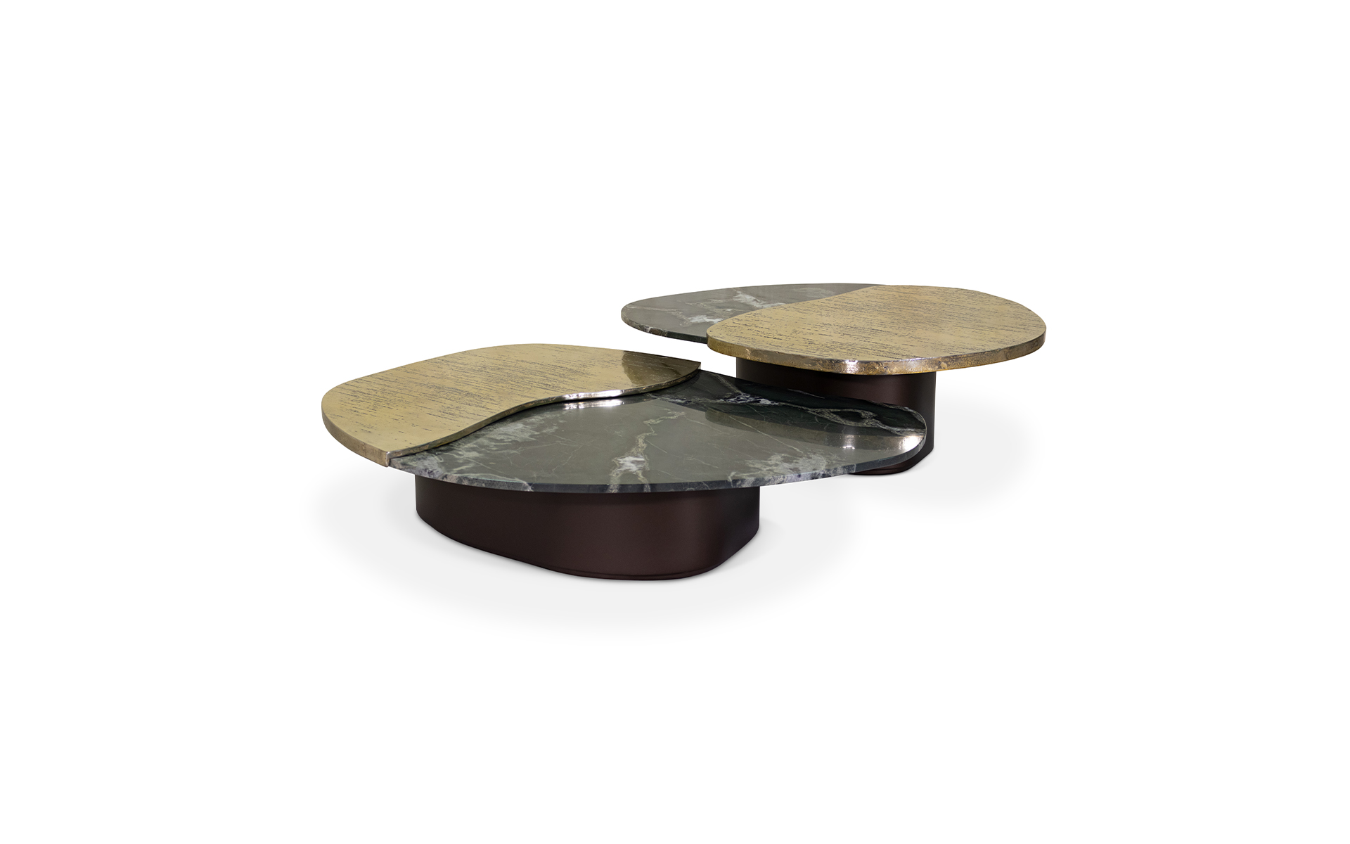 The Zaya Coffee Table is a sculptural piece that celebrates the meeting of forces beyond control, natural elements and the human gesture. Its organically shaped top blends marble and metal as if they were fragments shaped by time. It rests on a fiberglass base, solid as roots anchored deep in the ground. Designed to be the quiet center of any space, Zaya emerges as a duo of tables that complement and connect seamlessly.